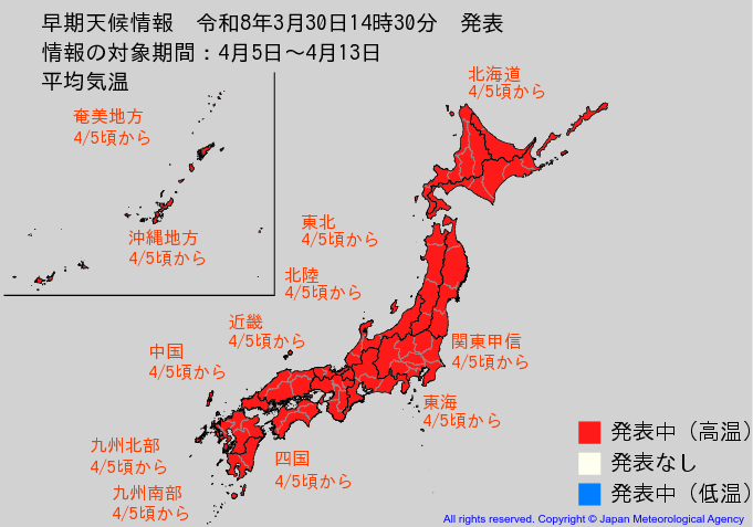 “10年に1度レベル”平年に比べ「気温がかなり高くなる」可能性 関東甲信、東海、北陸、近畿、北海道、東北、中国、四国、九州北部・南部、沖縄 4月5日頃から 気象庁「高温に関する早期天候情報」発表