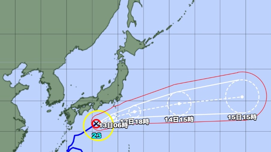 24時間後の13日午後6時には八丈島の東約330キロの北緯33度20分、東経143度20分を中心とする半径105キロの円内に達する見込みで、中心の気圧は970ヘクトパスカル、中心付近の最大風速は35メートル、最大瞬間風速は50メートルが予想されます。予報円の中心から半径220キロ以内では風速25メートル以上の暴風域に入るおそれがあるということです。