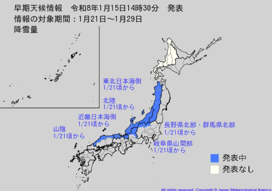 気象庁は1月15日、関東甲信、東海、北陸、北海道、東北、近畿、中国、四国、九州北部・南部、沖縄地方の全国各地に「低温に関する早期天候情報」を発表しました。対象期間は1月21日ごろから29日ごろにかけてで、この時期としては、かなりの低温になる可能性があるということです。また、東北日本海側、長野県北部・群馬県北部、岐阜県山間部、北陸、近畿日本海側、山陰に「大雪に関する早期天候情報」を出しました。