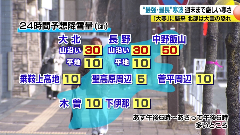 また、大雪も予想されています。21日午後6時からの24時間に予想される雪の量は、多い所で、中野飯山地域50センチ、長野地域と大北地域の山沿いで30センチ、平地で10センチなどとなっています。