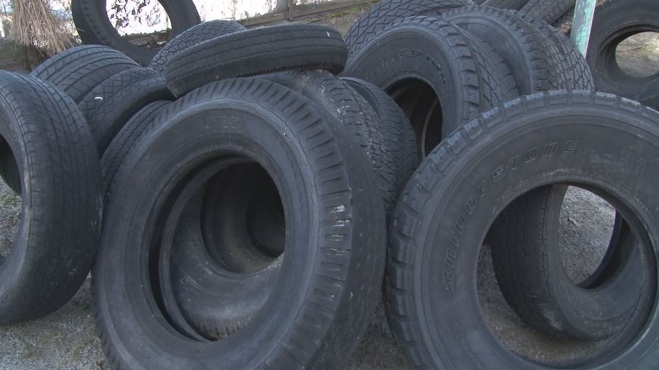 諏訪市の旧城北小学校のグラウンドに置かれた32本のタイヤ。