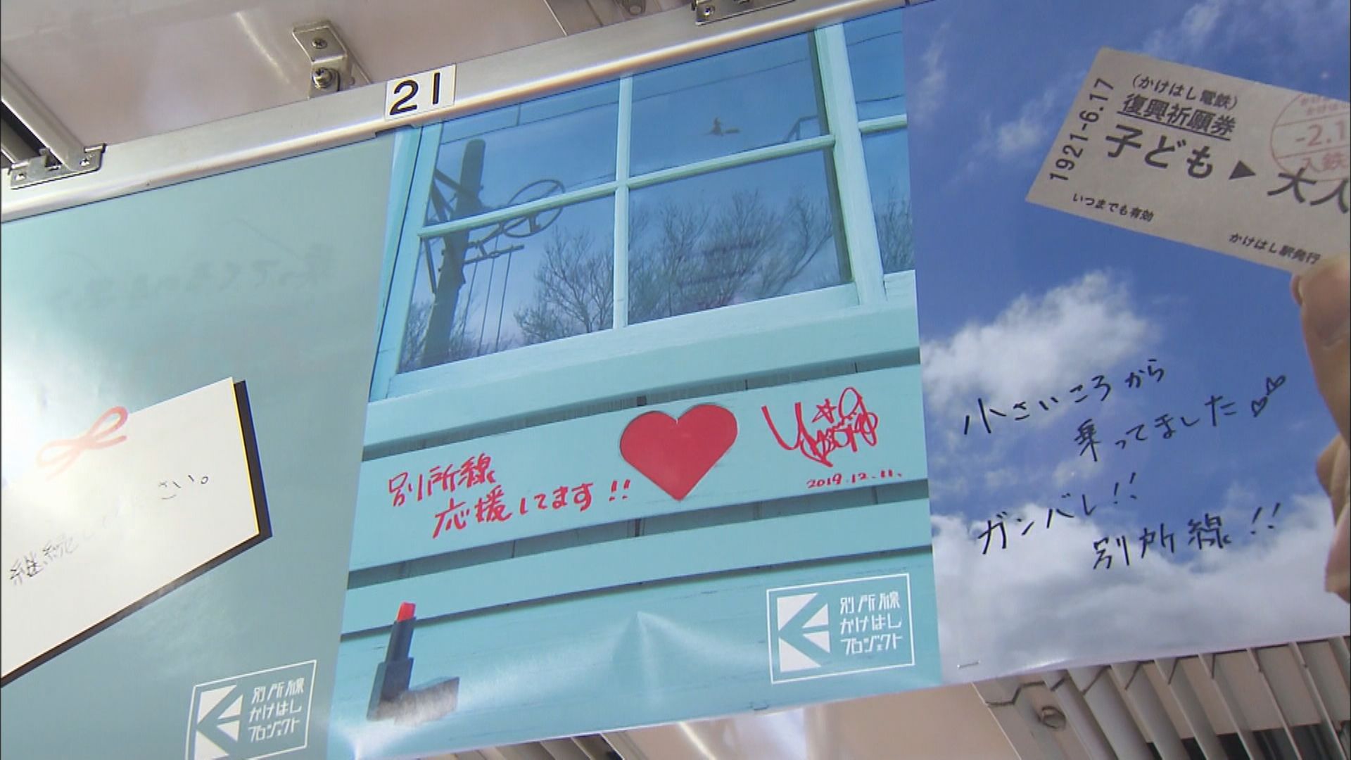 通学で使う長野大学の学生有志は、中づり広告の応援メッセージを募り、その「掲載料」を寄付。