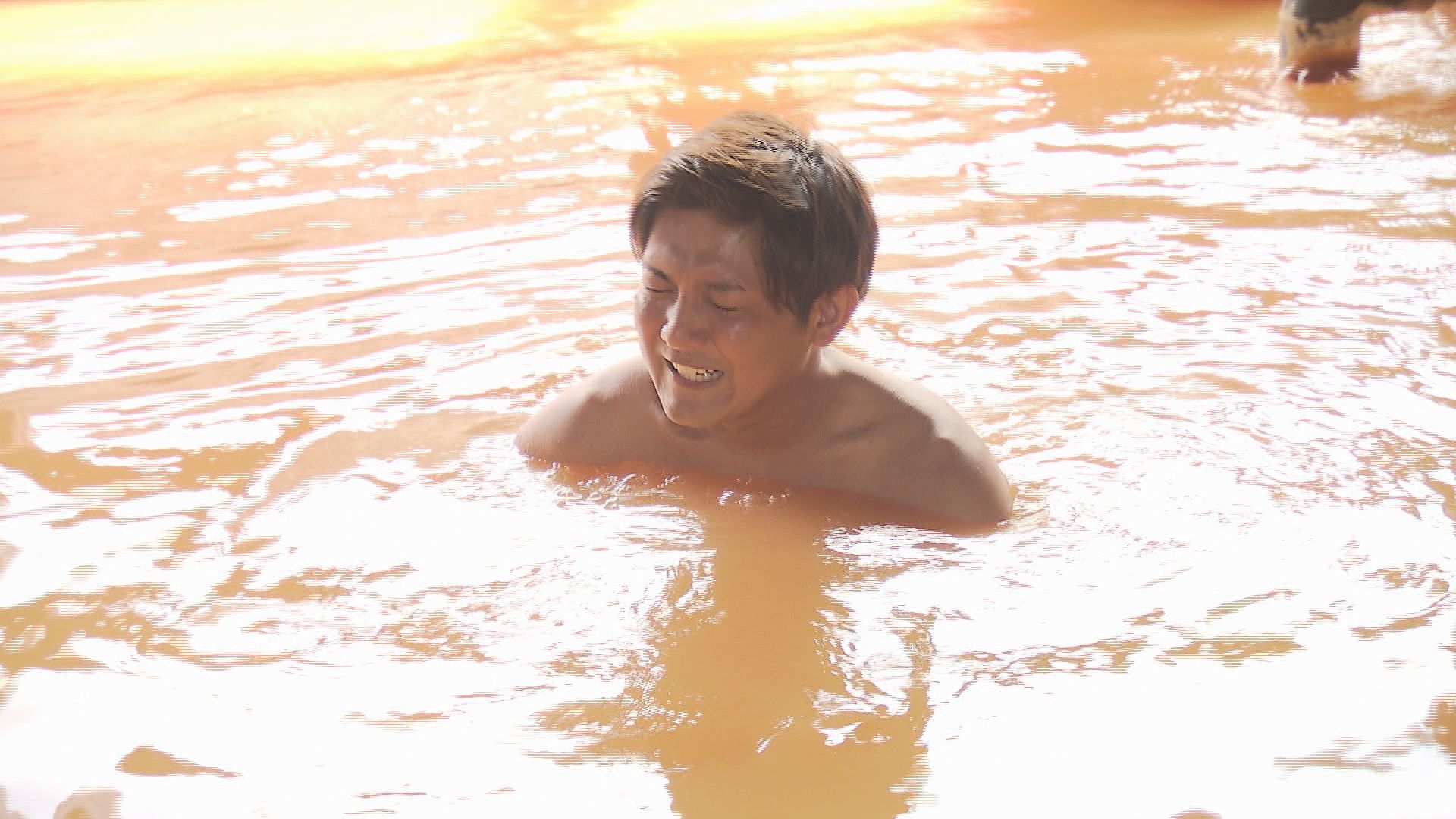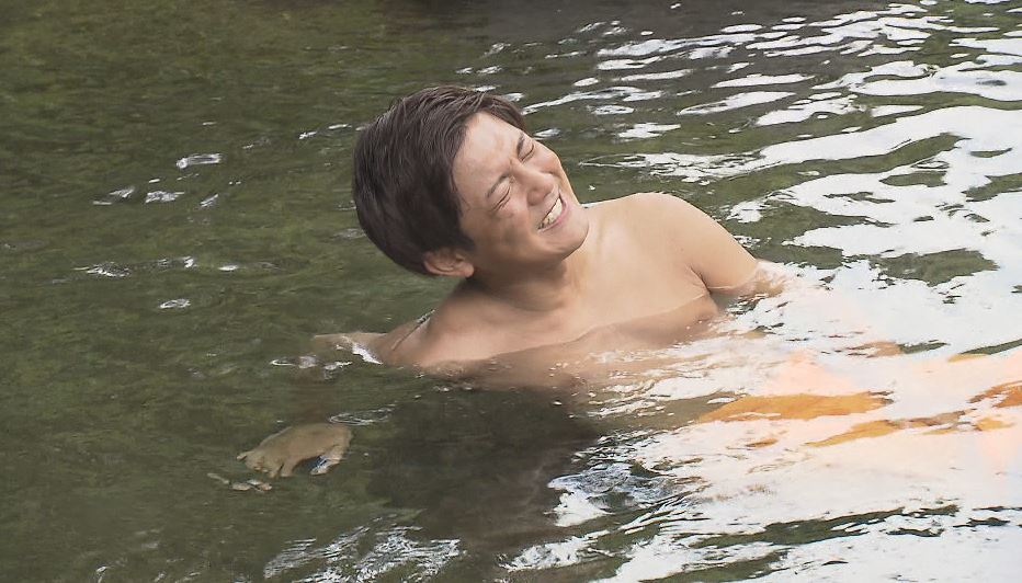 秘境にある温泉に漬かる松山アナウンサー