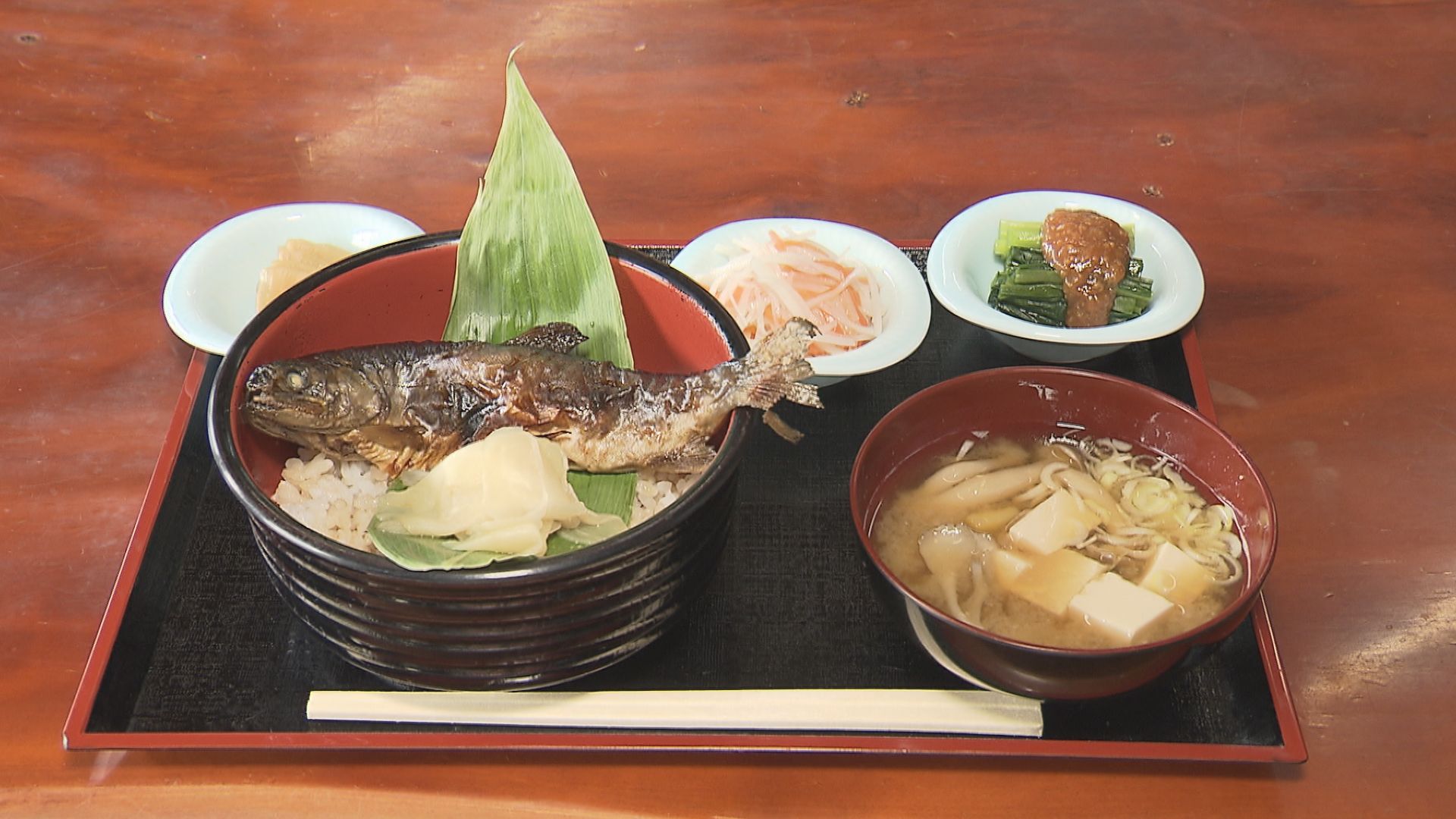 楽養館では食事も楽しめる。岩魚(いわな)を1匹丸まる使った「岩魚丼」。焼いた岩魚をしょうゆなどで煮込み1匹丸ごとのせている。