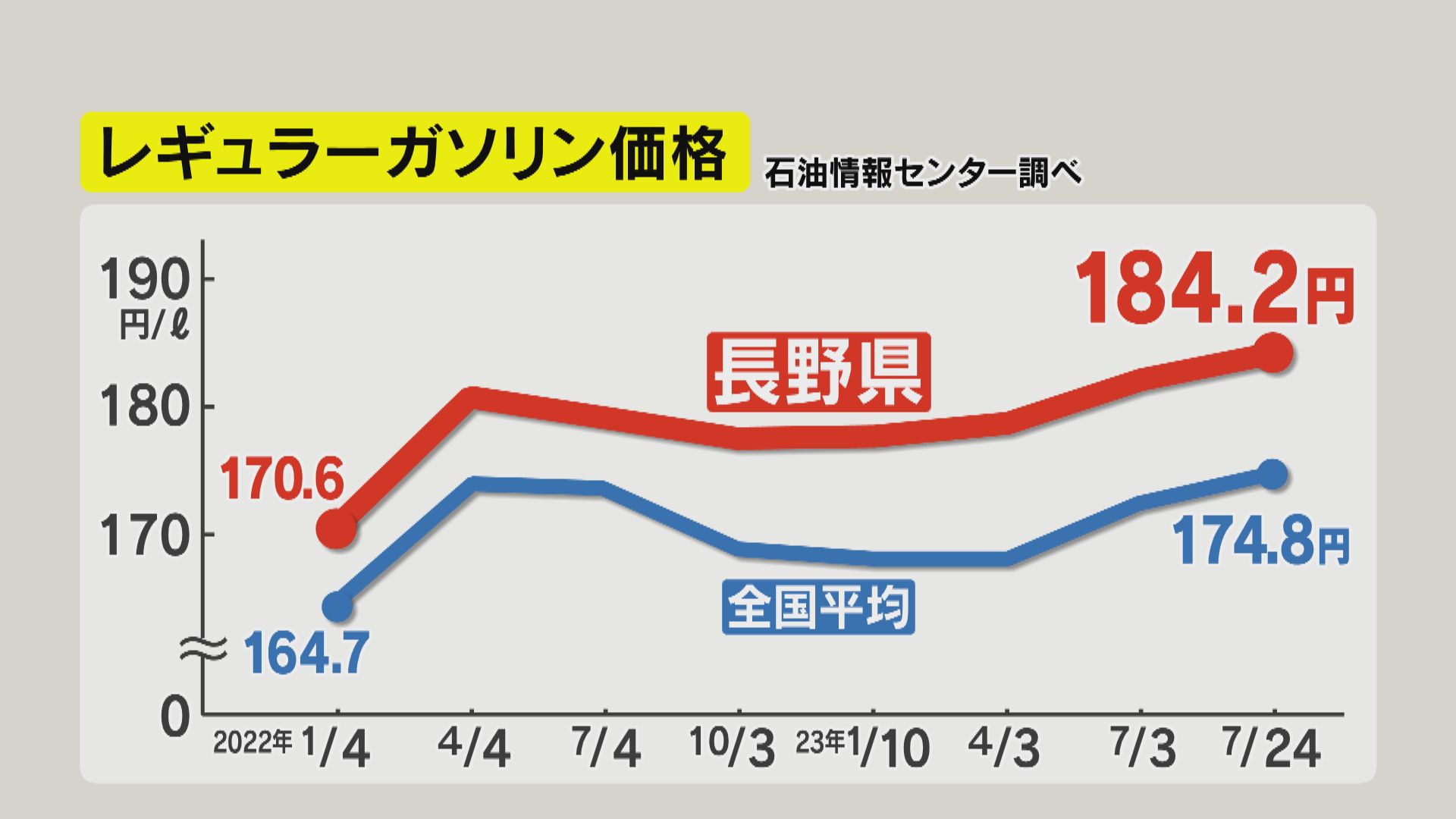 レギュラーガソリン販売表示価格184円(7月26日 長野市内のガソリンスタンド)