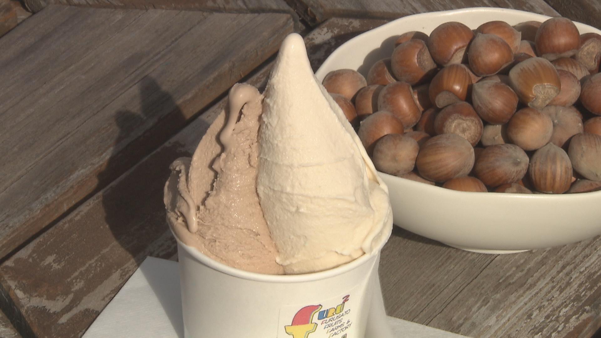 9年前、ヘーゼルナッツの栽培を始め、生アイスの店も開いた岡田浩史さん(63)。