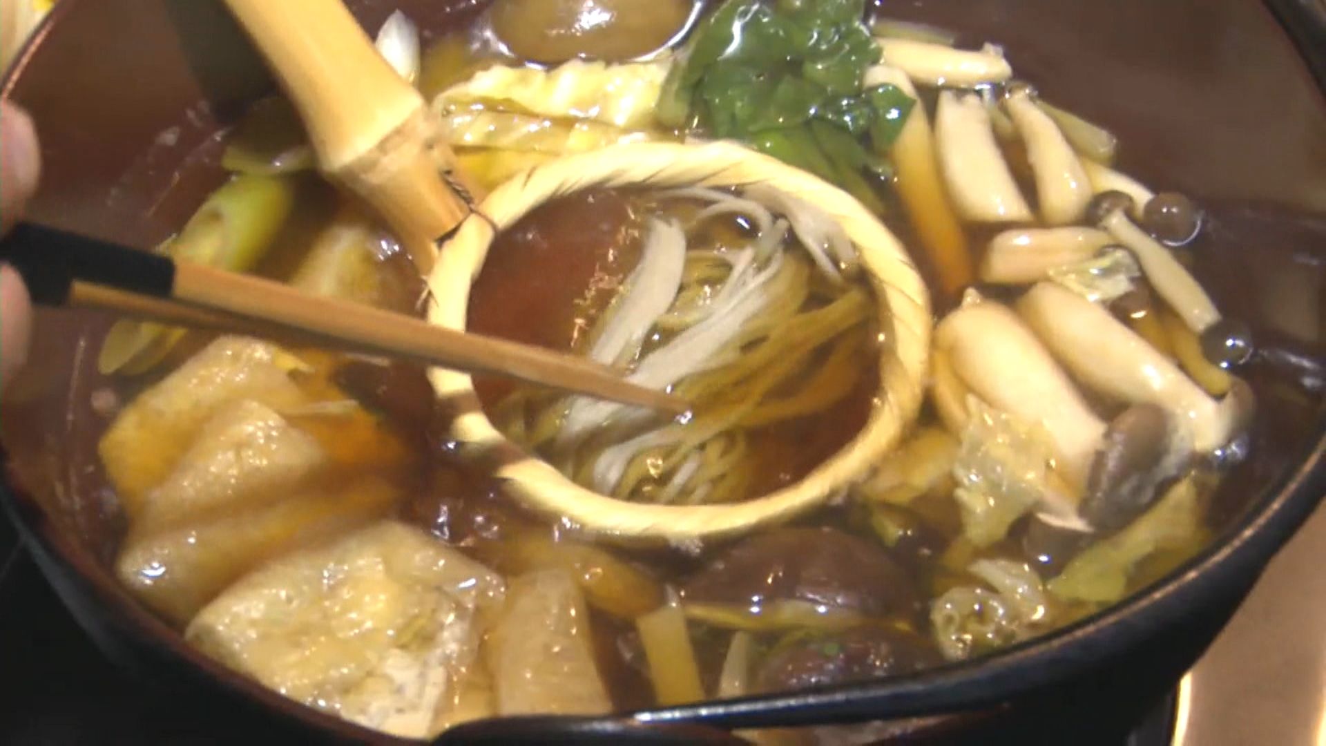 これとよく似たのが松本市奈川地区の「とうじそば」。北信地方でも「おとうじ」と呼ばれ、ひやむぎやそばを入れて食べられてきました。東信では「おにかけそば」と呼ばれ、店ではうどんに替えた「おにかけうどん」も出しています。こちらも大勢が集まる席で食べられてきたのではないかということです。