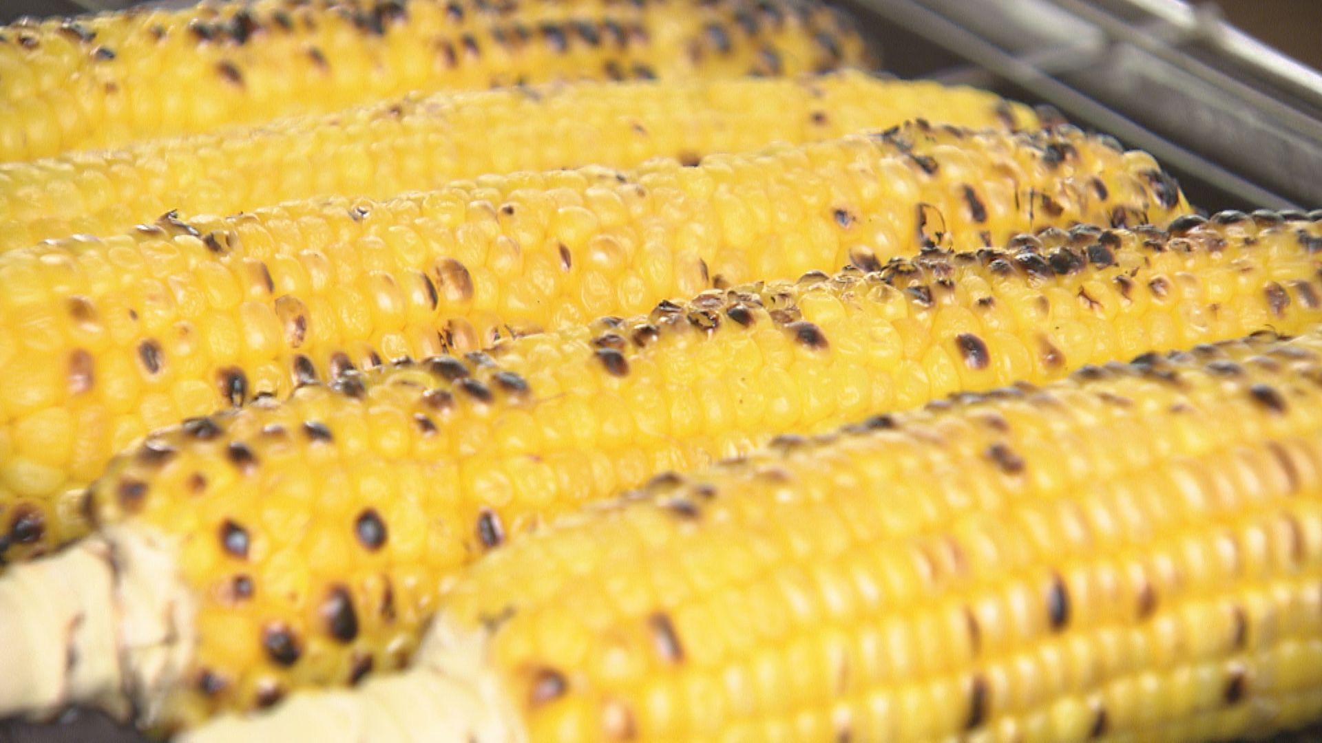 客のお目当ては、名物の「焼きトウモロコシ」です。香ばしいしょう油の香りが食欲を誘います。
