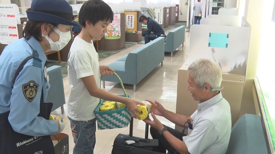 18日、塩尻市の八十二銀行塩尻支店で行われた特殊詐欺の啓発活動。警察官とともに呼びかけたのは、塩尻市の小学6年生・中島丈さんです。