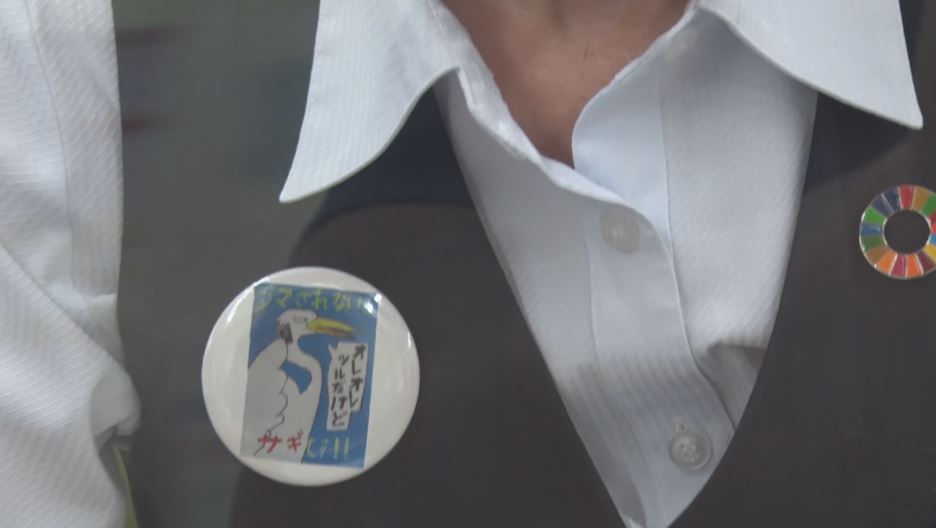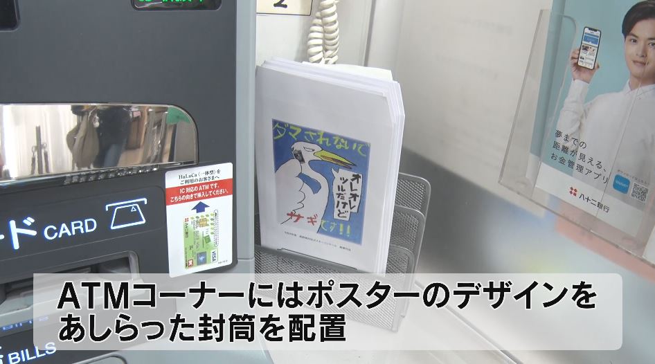 18日、警察官とともに銀行を訪れた丈さん。支店長に手渡したのは、ポスターの絵が描かれたバッジ。行員にこれをつけてもらい、利用客に注意喚起しようという狙いです。ATMコーナーにはポスターのデザインをプリントした封筒も配置しました。
