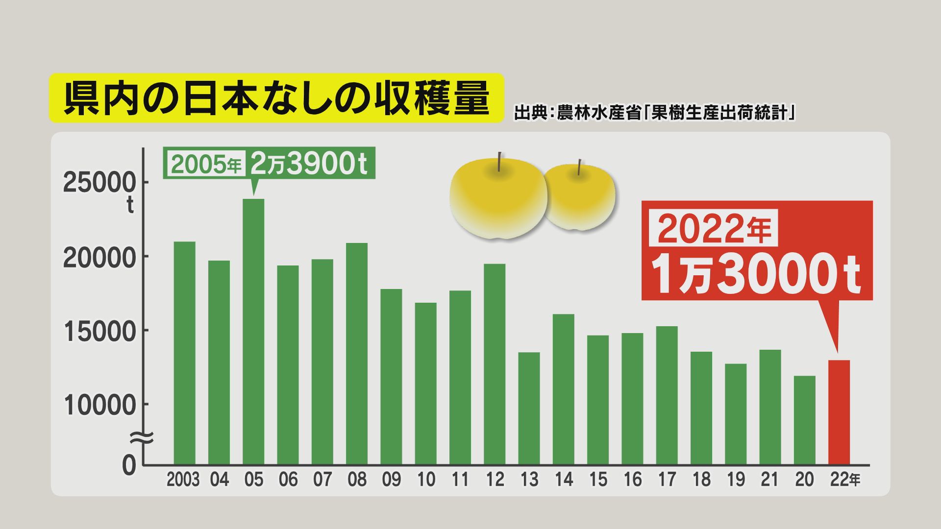 県内の日本ナシの収穫量 出典:農林水産省「果樹生産出荷統計」