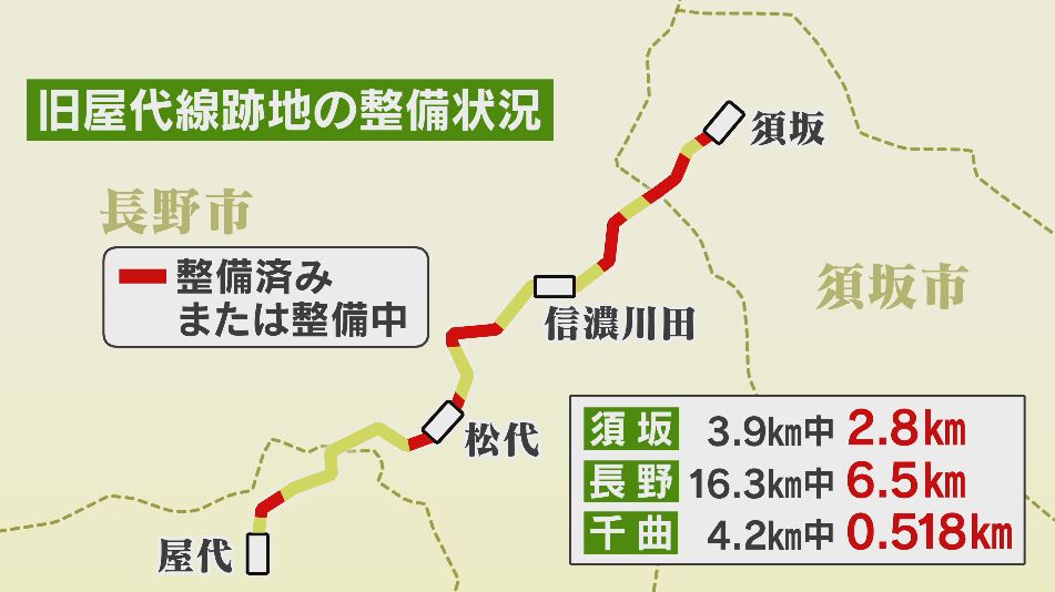最も長い16.3キロを譲り受けた長野市はまだ6.5キロのみ。須坂市は3.9キロ中2.8キロとなっています。