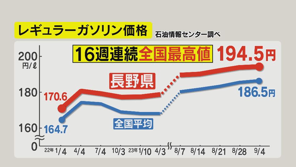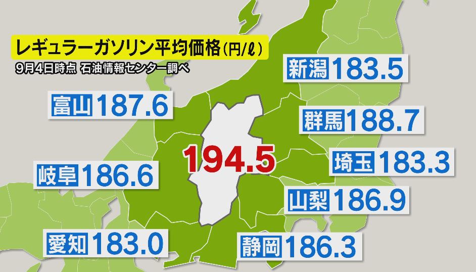 先週の県内のレギュラー1リットルあたりの平均価格は194.5円(9月4日時点)。16週連続で全国最高値となっています。