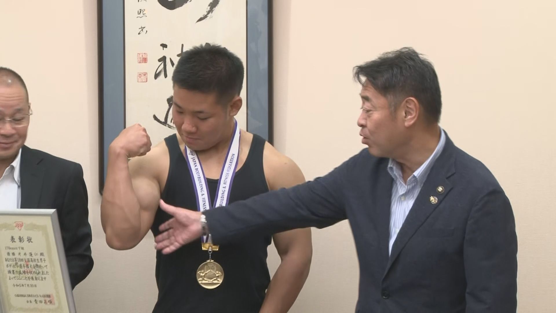 5日、両親とともに柳田清二市長に優勝を報告。「日本一」の筋肉も披露しました。