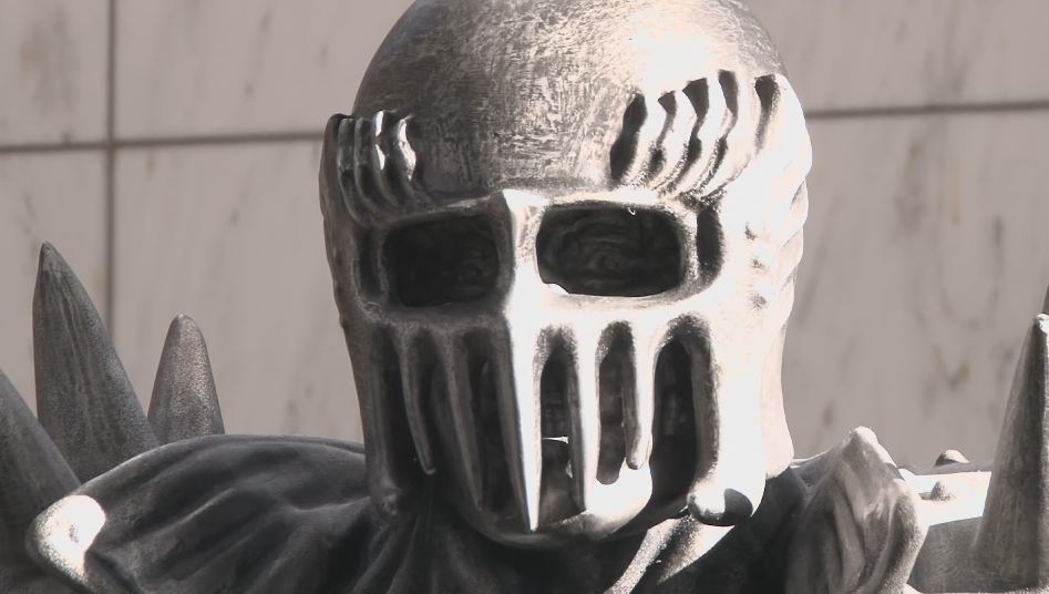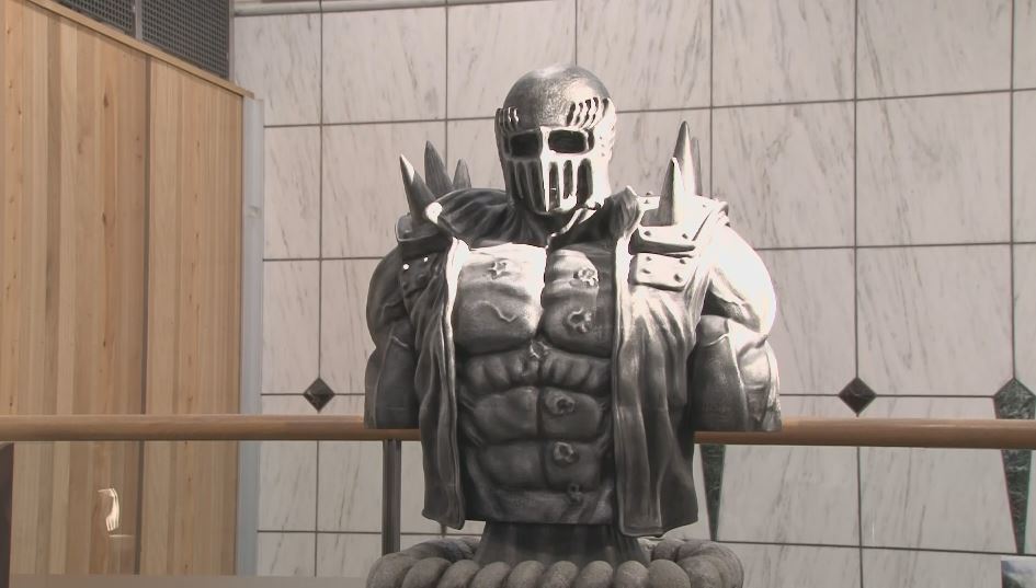 仮面をかぶった男。人気漫画「北斗の拳」のキャラクター「ジャギ」です。15日、佐久平駅で胸像がお披露目されました。