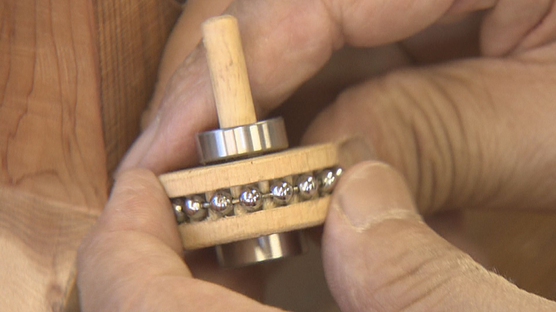 ボールチェーンで月に見立てた木材を回転させます。