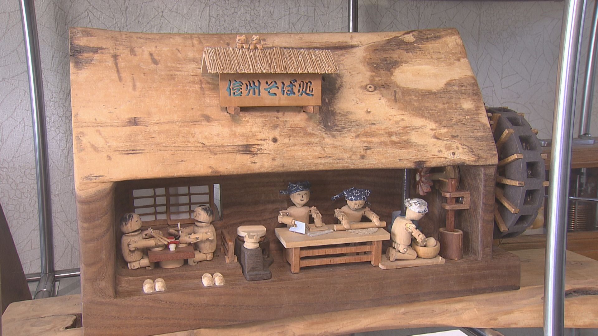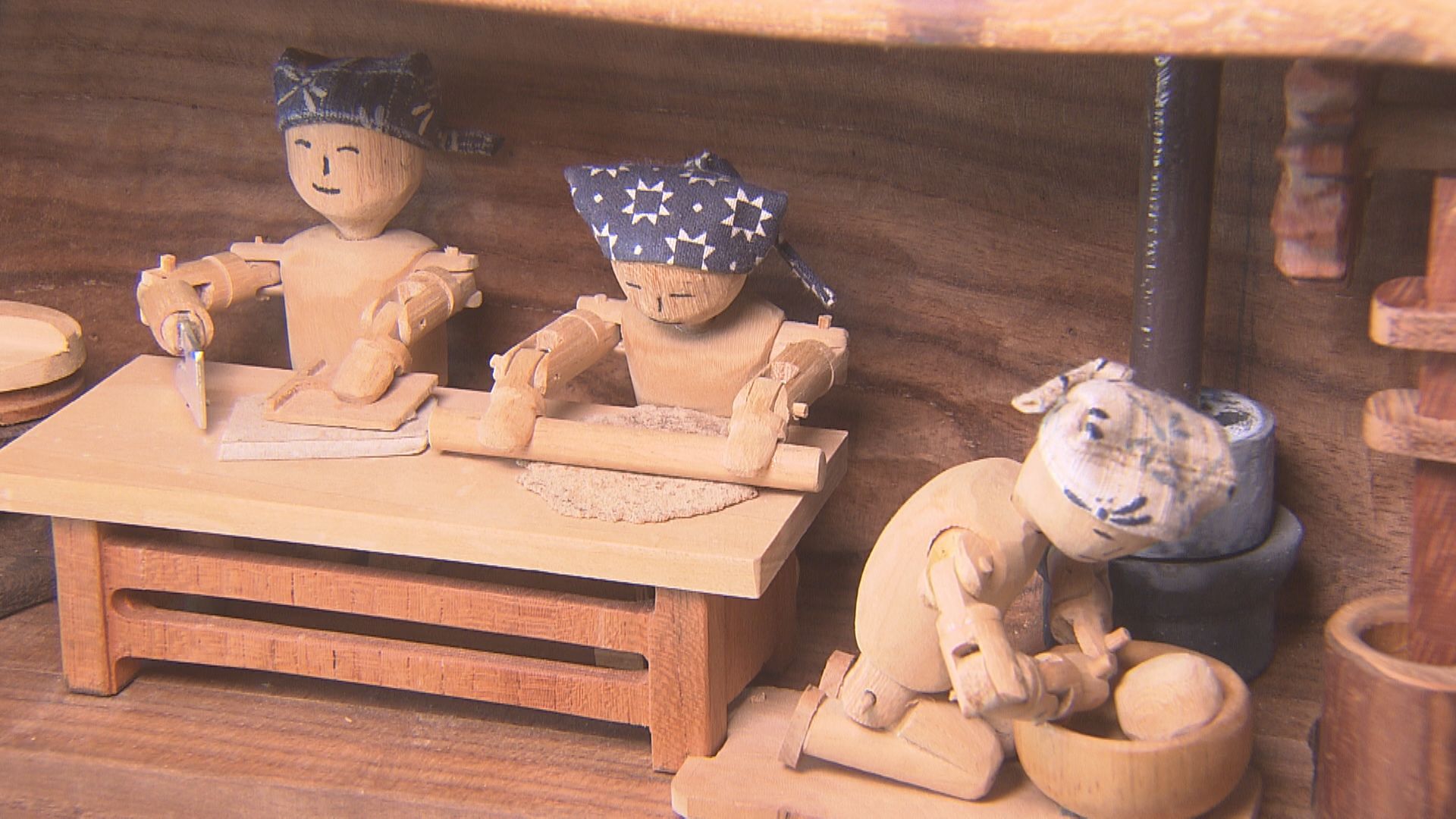 ハンドルを回すと、そば打ちを始める木製の「からくりおもちゃ」