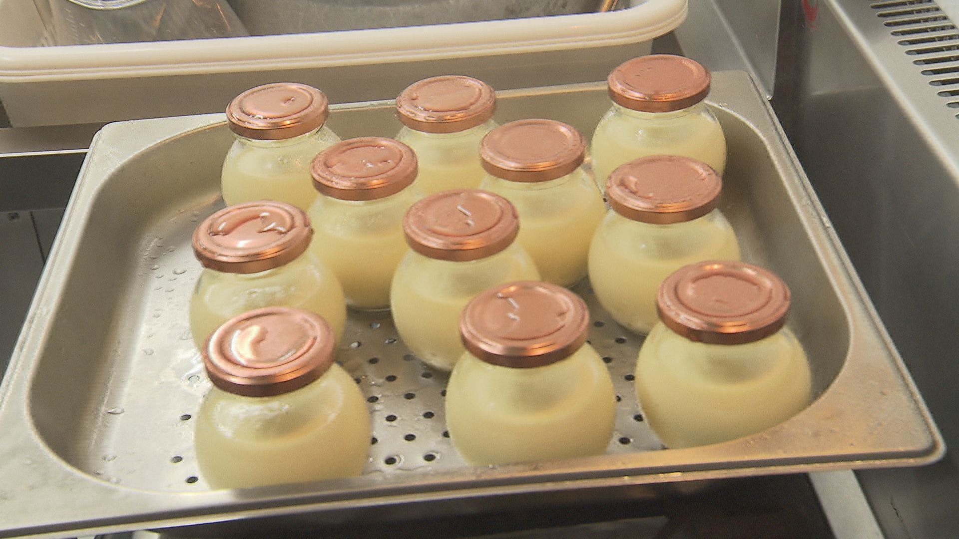 卵やグラニュー糖、生クリームなどを混ぜたプリンの液を瓶に入れ、オーブンで蒸します。