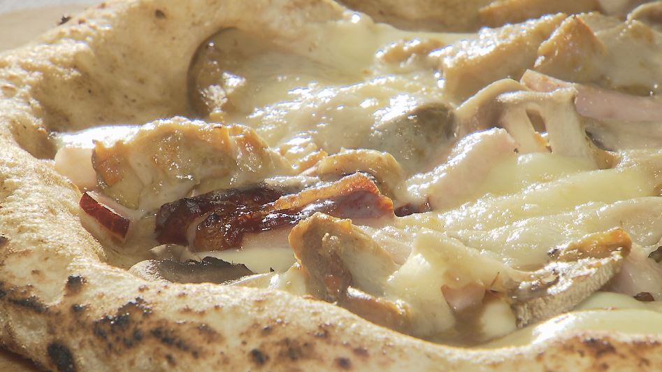 焼きたてのピザ。チーズとは異なる独特の香りが漂ってきました。それもそのはず。実はソースにも、具材にも「ポルチーニ」を使ったこちらの店の「新作ピザ」です。