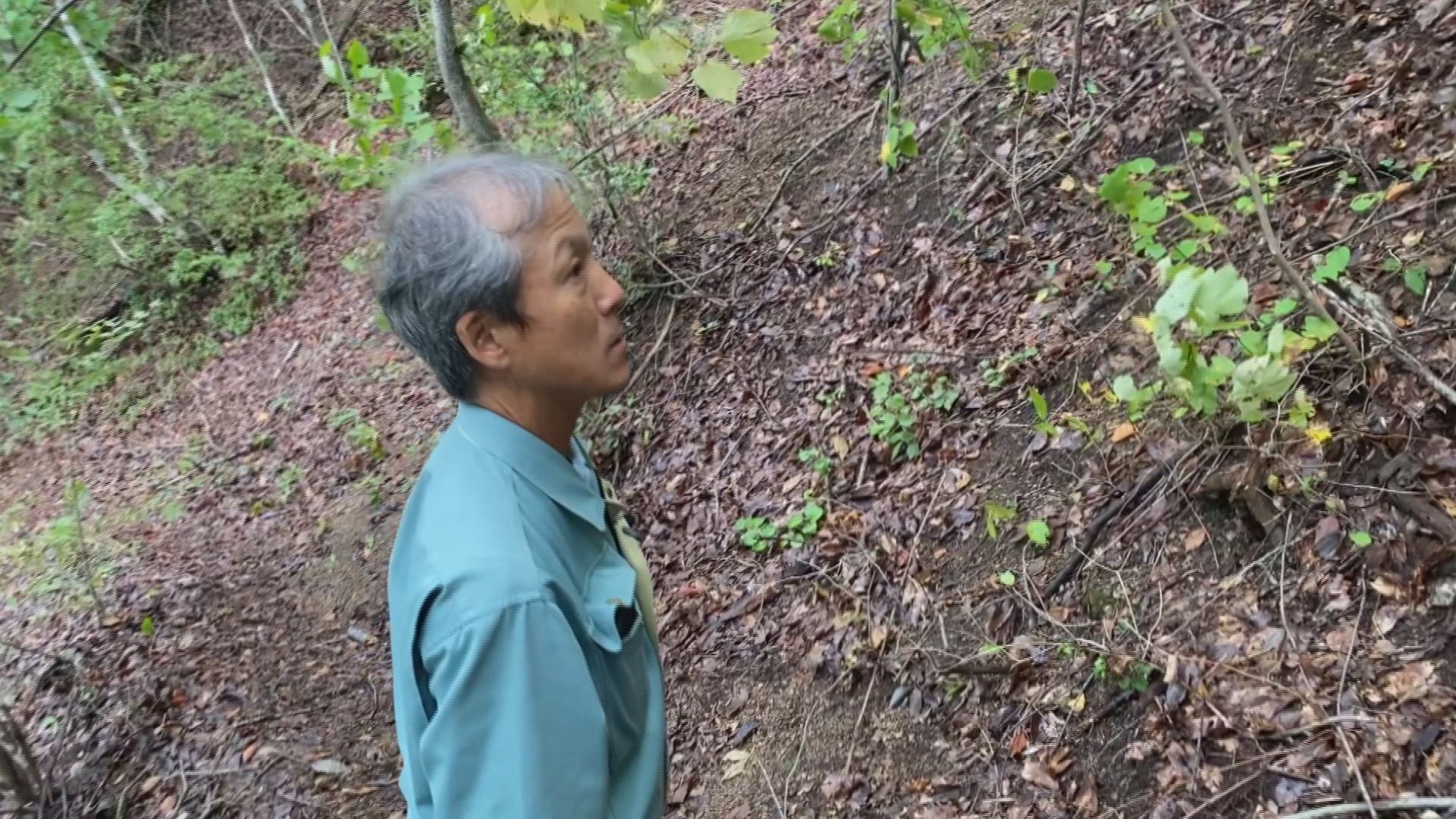 長野市内の山でキノコ採りをする大内謙二さん(57)。