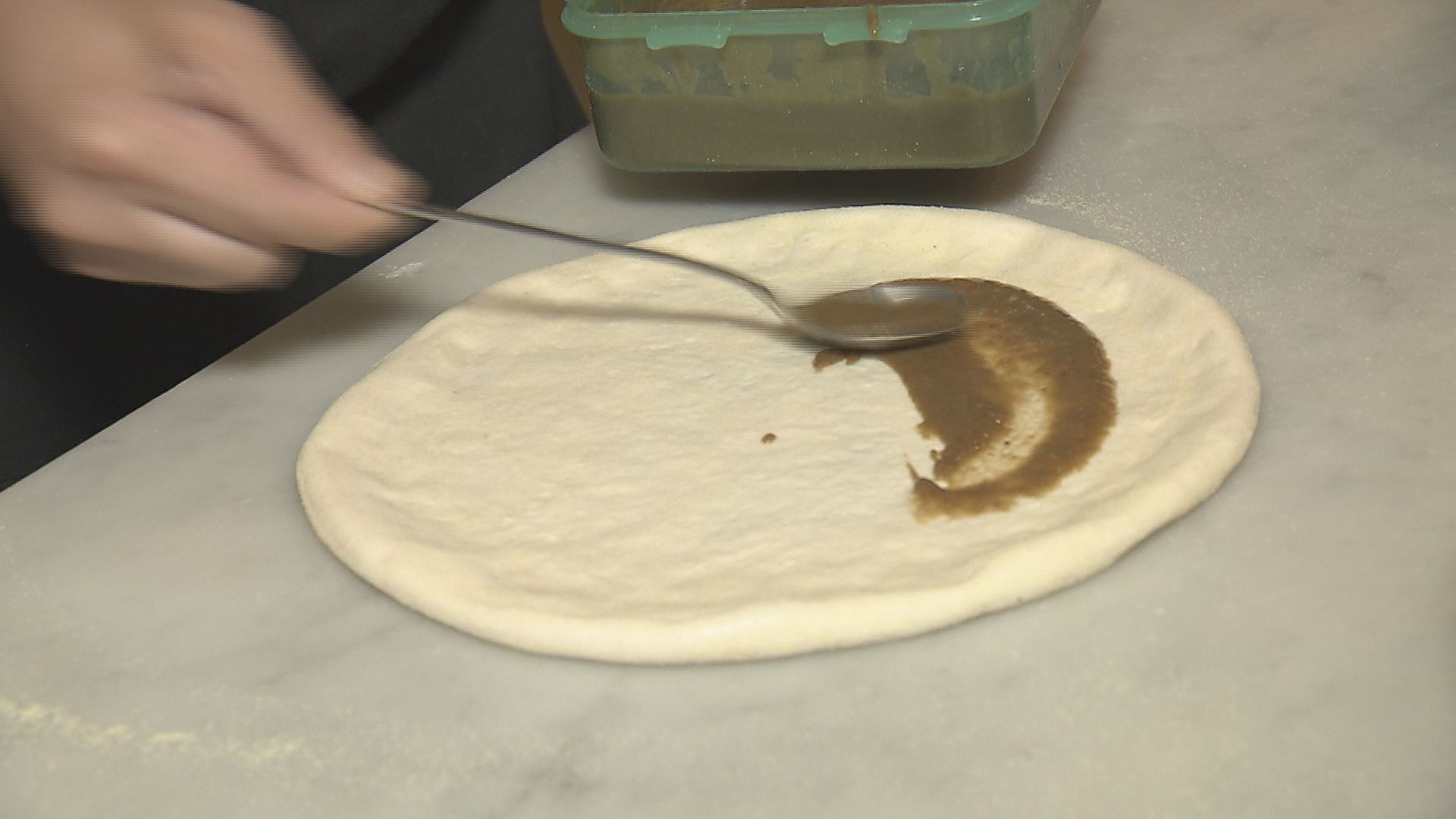 まず乾燥ポルチーニを水で戻し、ミキサーにかけたものを、ソースとして生地に塗ります。