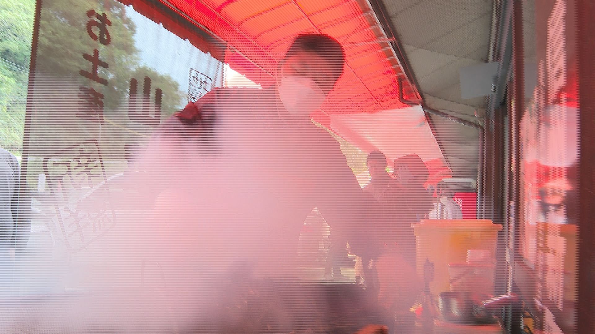 この日は無料配布。音に誘われて、客が列を作り、早速、サクサクとした食感の「とっかん」を味わっていました。