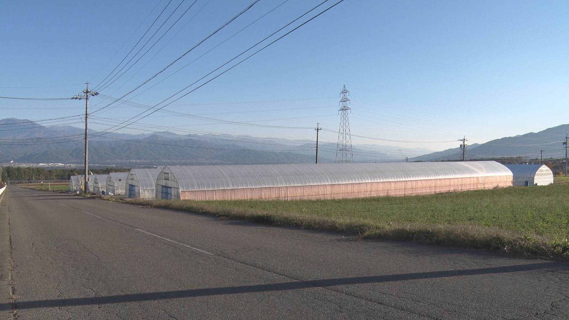 南アルプスを見渡す高台に並ぶ農業用ハウス。
