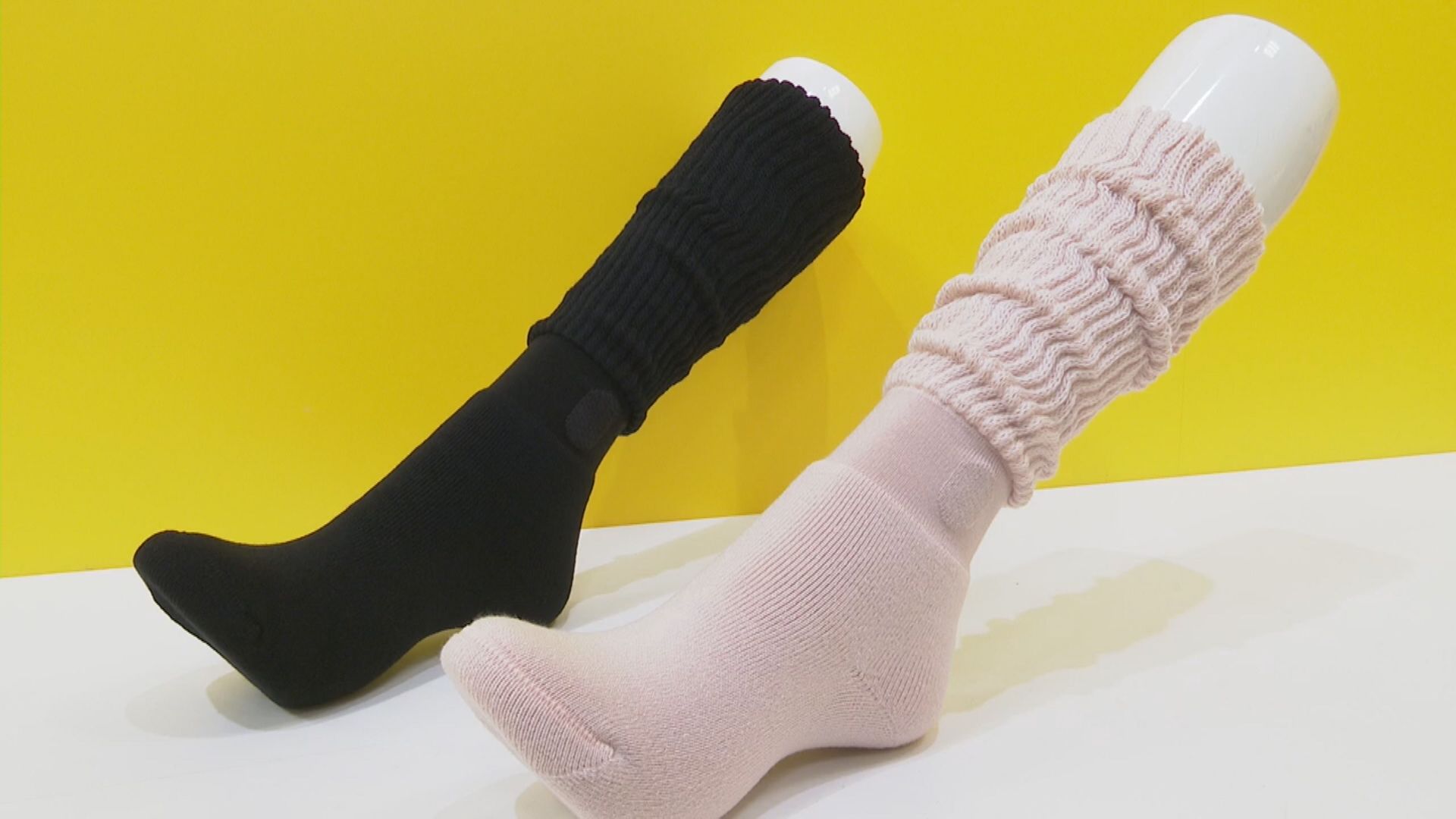 「こちら『まるでこたつソックス』シリーズになります。ソックス自体が厚みがすごくありまして、こたつに入っているかのような、じんわりとした暖かさが特徴の商品です。冬場トイレに行くときとかも履いていくと、底冷えとかヒートショックとかにもいい」