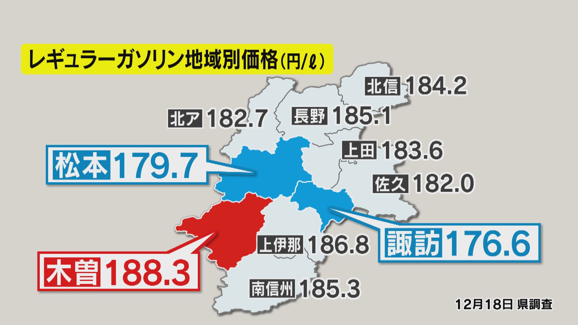 180円台が多い中、諏訪や松本地域は170円台で、最も高い木曽地域と10円ほどの差があります。