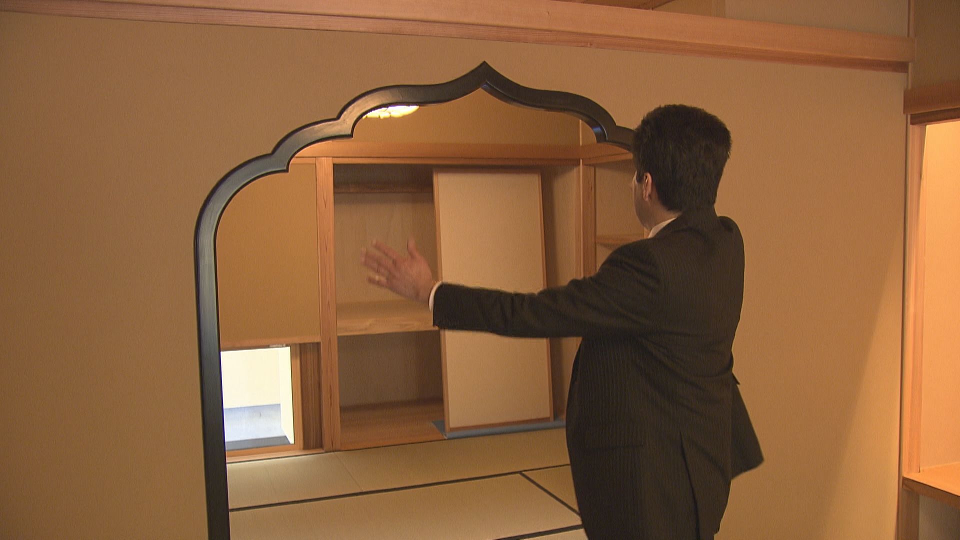 「印象的な花頭窓。前の松籟荘の『きくの間』にもあったんですよ。印象深い意匠・デザインを再現しました」