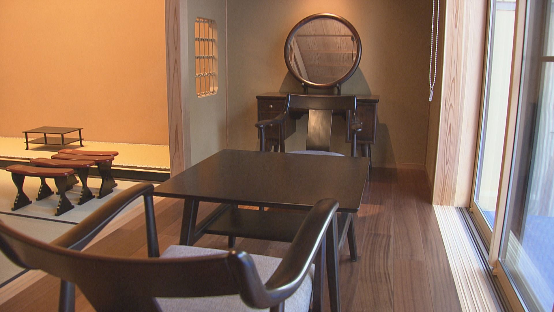 客室には以前と同じように松本民芸家具を置き、前の松籟荘の雰囲気を伝えています。