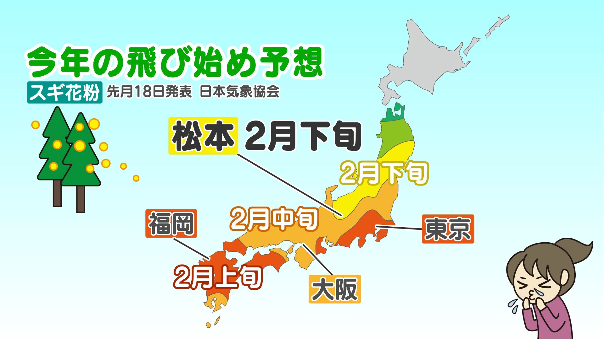 日本気象協会は県内の飛散開始の時期を南部や中部の一部は2月中旬、北部を中心としたそれ以外の地域は2月下旬と予想しています。