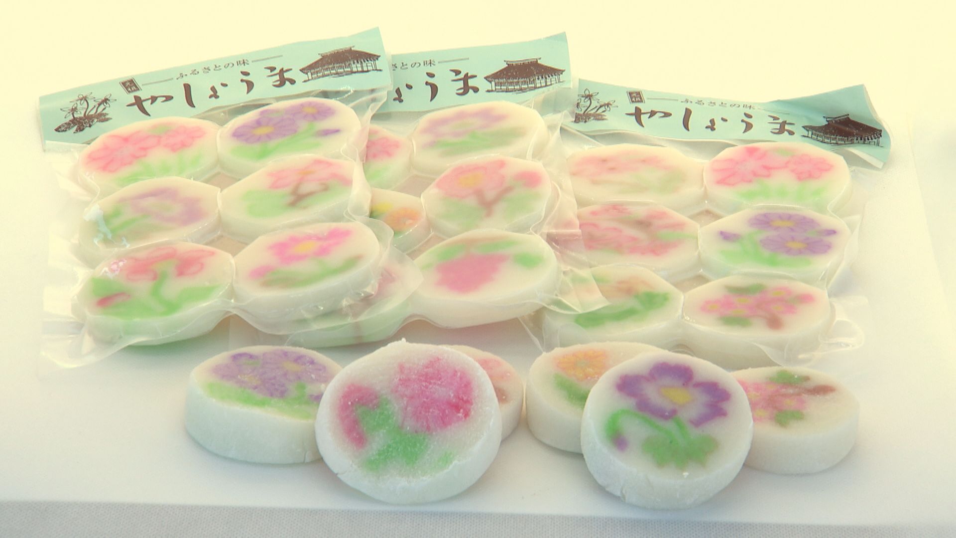 ピンクや紫の鮮やかな花の模様が入っています。郷土料理の「やしょうま」です。