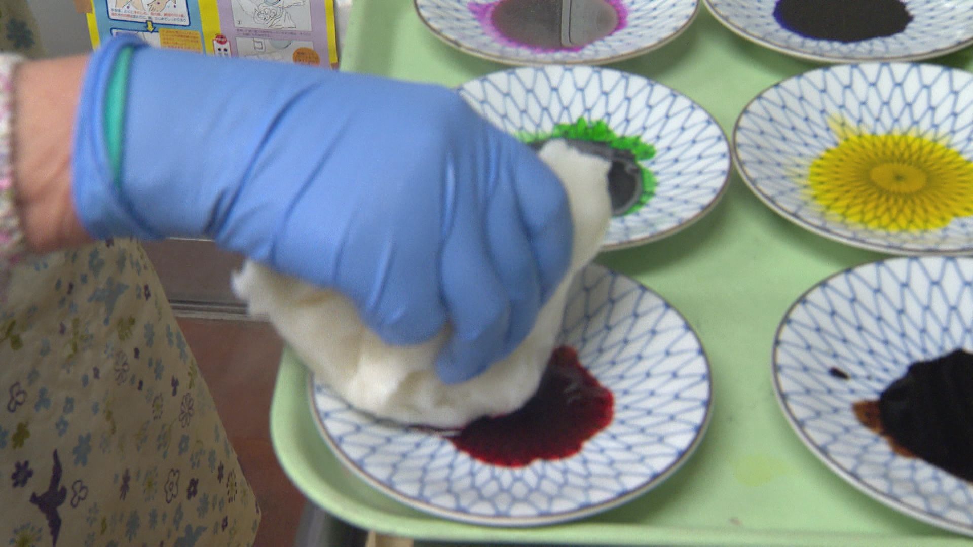 続いて生地に赤、黄、緑など6色の食紅で色をつけます。