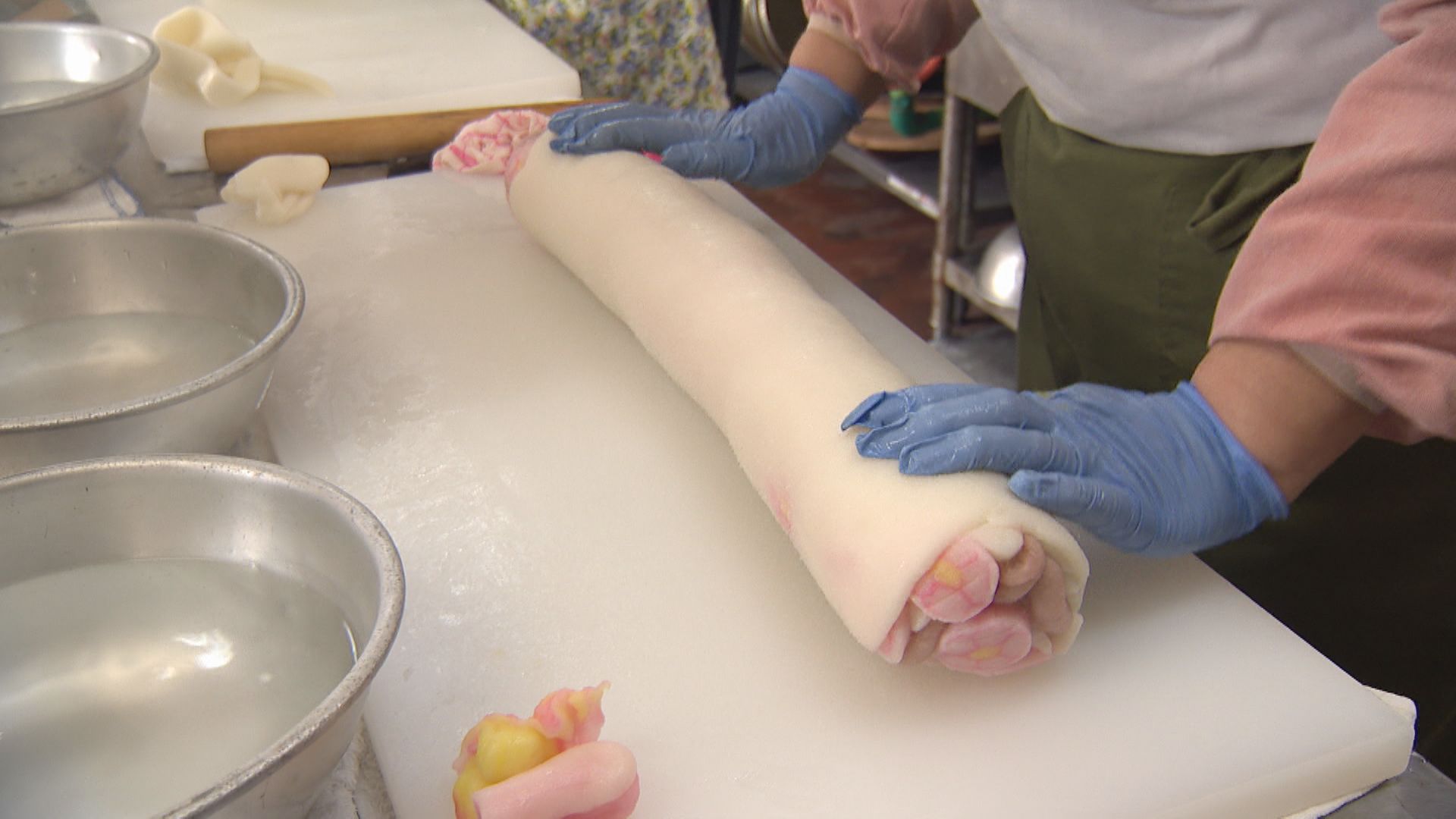 白い生地で包み、体重をかけて伸ばします。