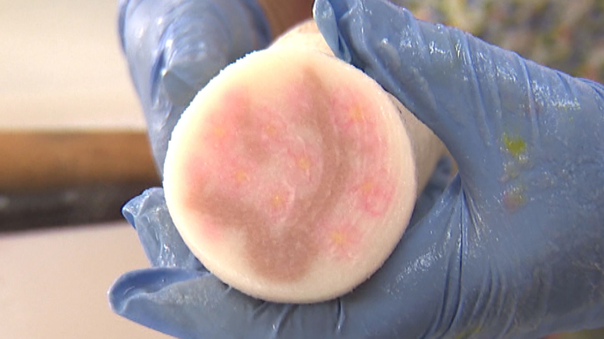 糸で切ってみると断面は花の模様に。