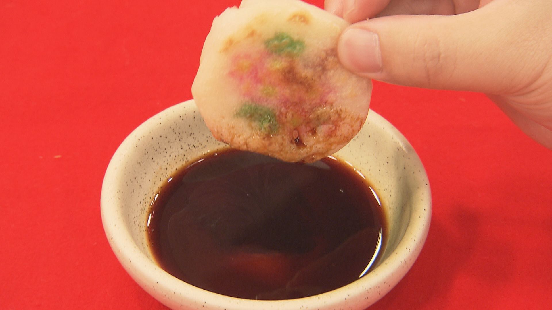 作り方もやや異なります。米粉を使うのは同じですが、砂糖と塩の他に青のりやしそを混ぜて作られています。