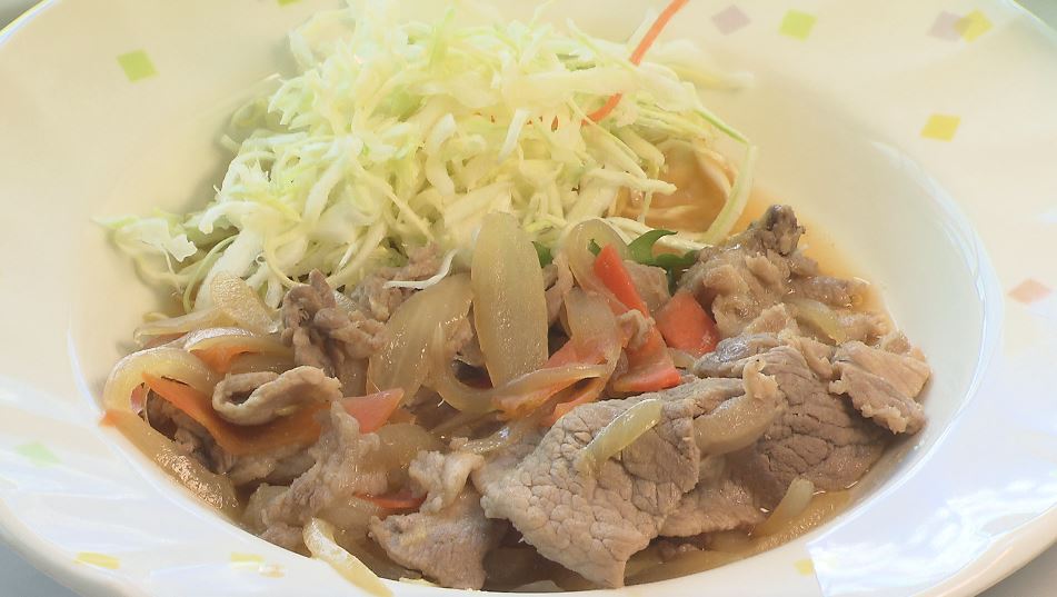 豚肉の生姜焼きにハムを使ったサラダ、みそ汁には糸寒天が入っています。18日から県庁の食堂で提供されている期間限定メニュー「バイ信州定食」(600円)です。