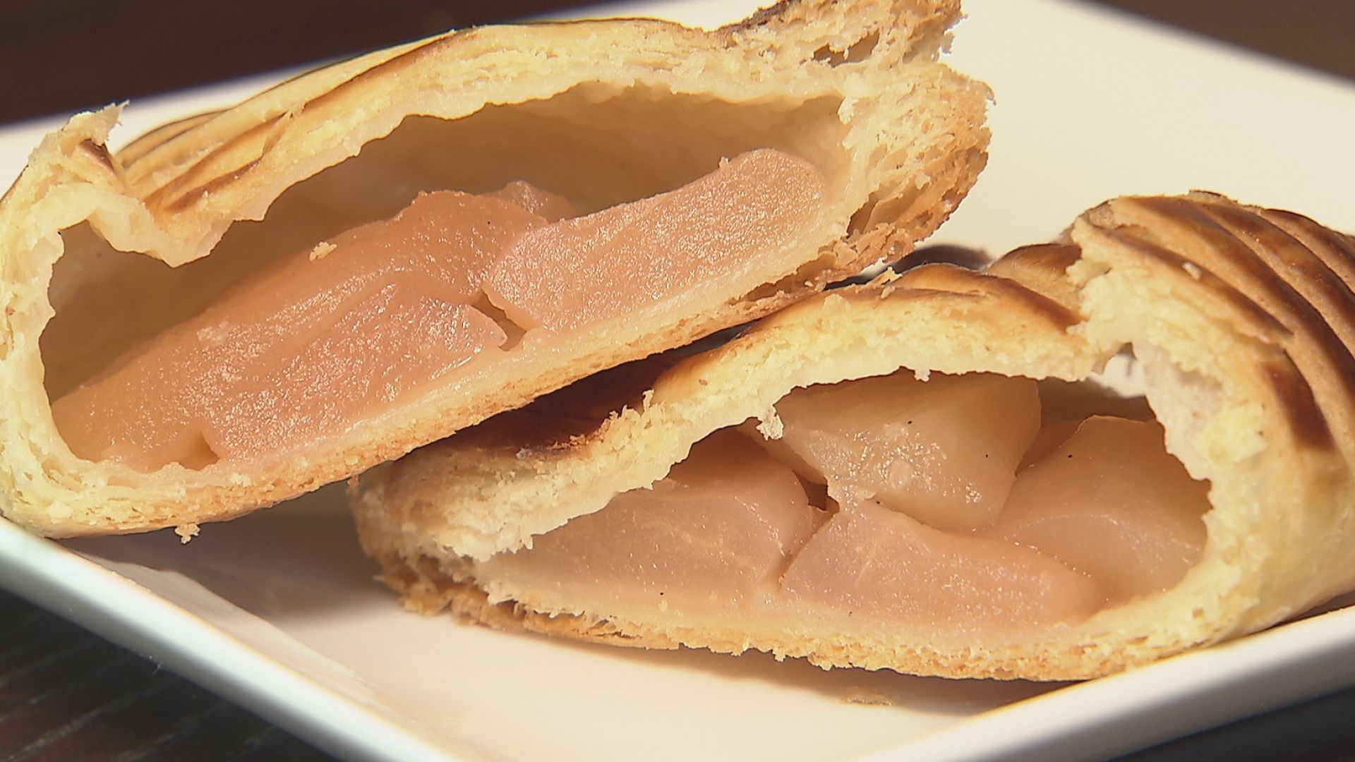 「いただきます。生地サクサクでおいしい。口に入れた瞬間、バターのいい香りが広がってきます。後からリンゴの程よい甘みと酸味も感じられておいしい」