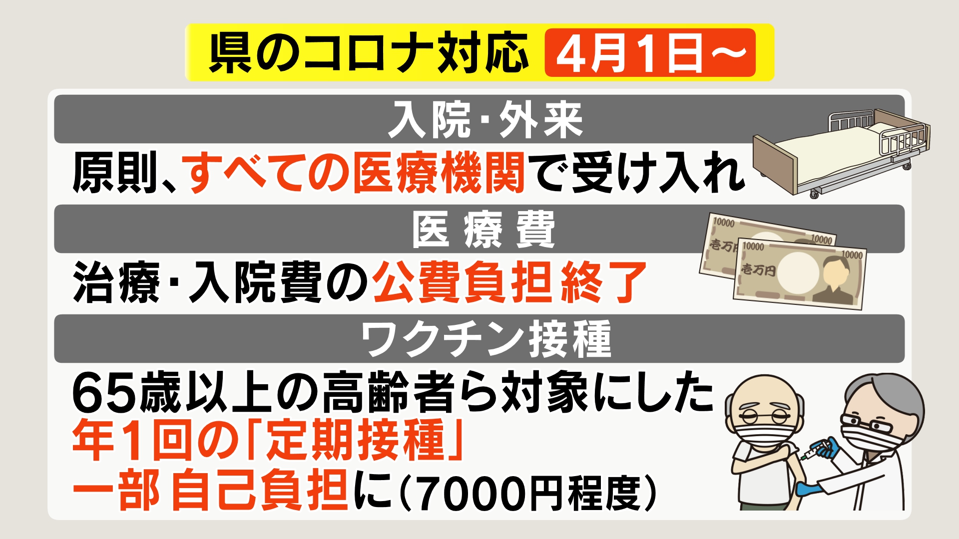 新型コロナウイルスへの対応は4月1日から大きく変わりました。重症者向けの専用の病床の確保などは無くなり、原則、全ての医療機関で受け入れるようになりました。治療費や入院費の一部は公費負担がありましたが、これも無くなりました。無料だったワクチン接種も終了し、今後は65歳以上の高齢者などを対象にした年1回の「定期接種」に移行します。自己負担額は7000円程度になります。