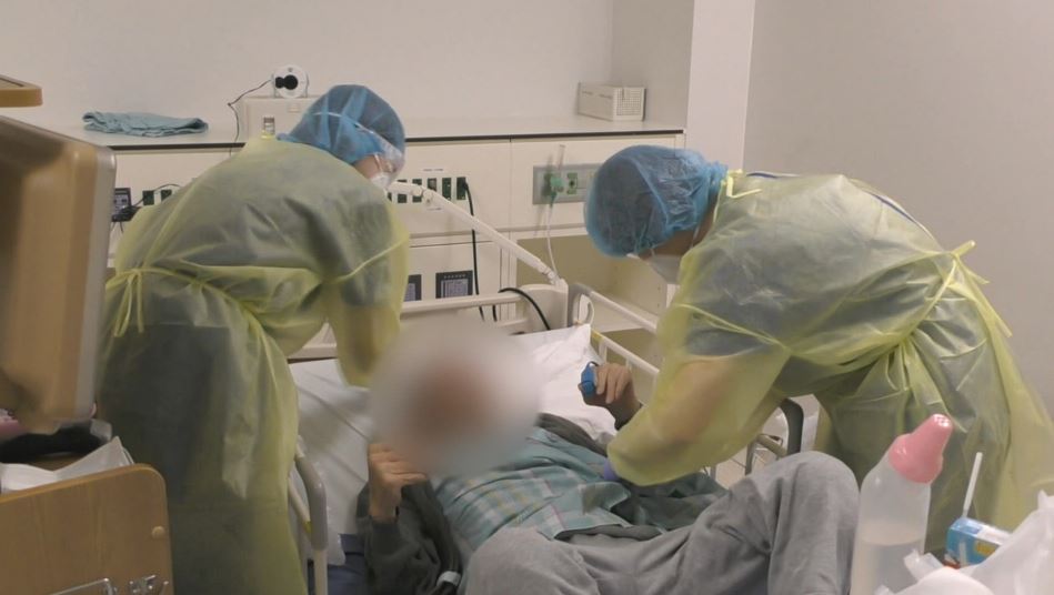 こちらは入院患者が多かった1月に撮影された病室の様子。感染を防ぐため防護服やゴーグルを付けて患者に対応していました。4月から「通常医療」になりましたが、当時と変わらない対策を続けていると言います。