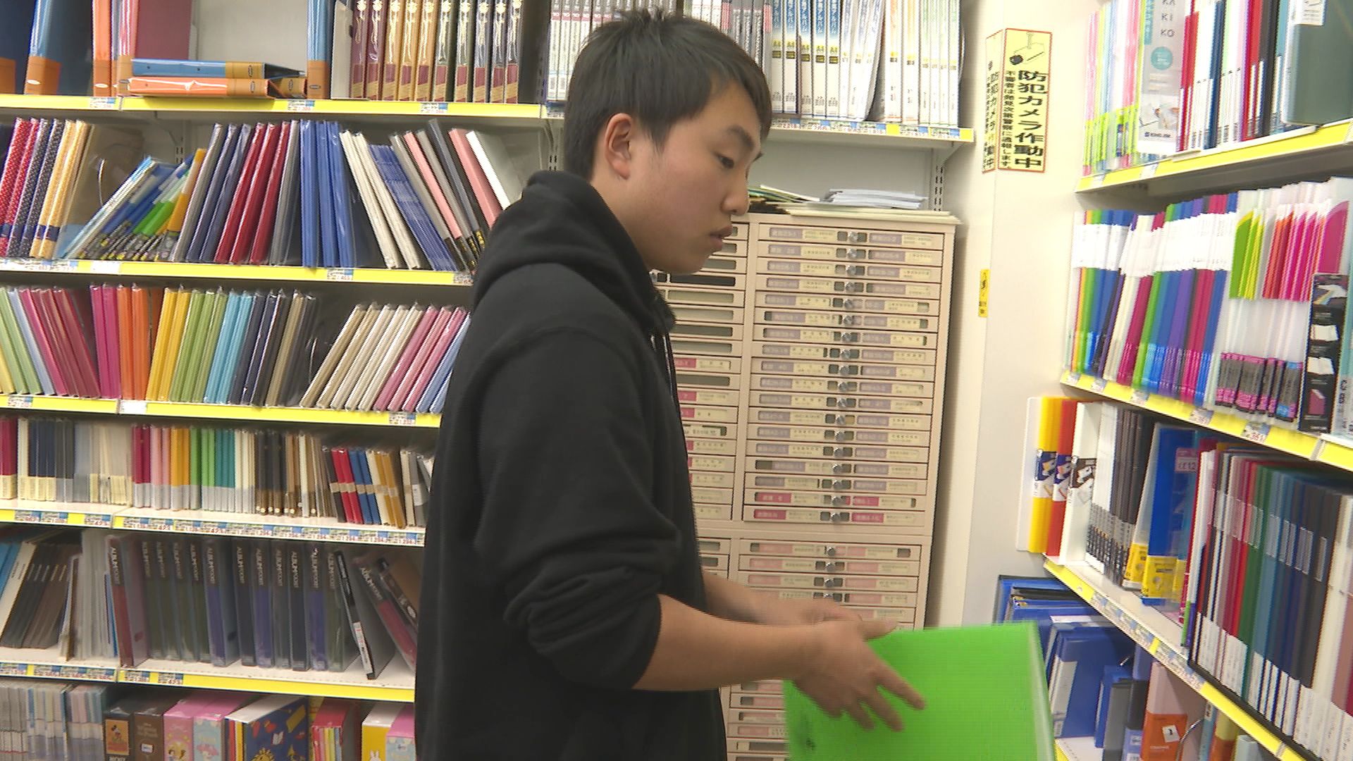 進学先は新潟の大学。父親と一緒に文具をそろえに来ました。