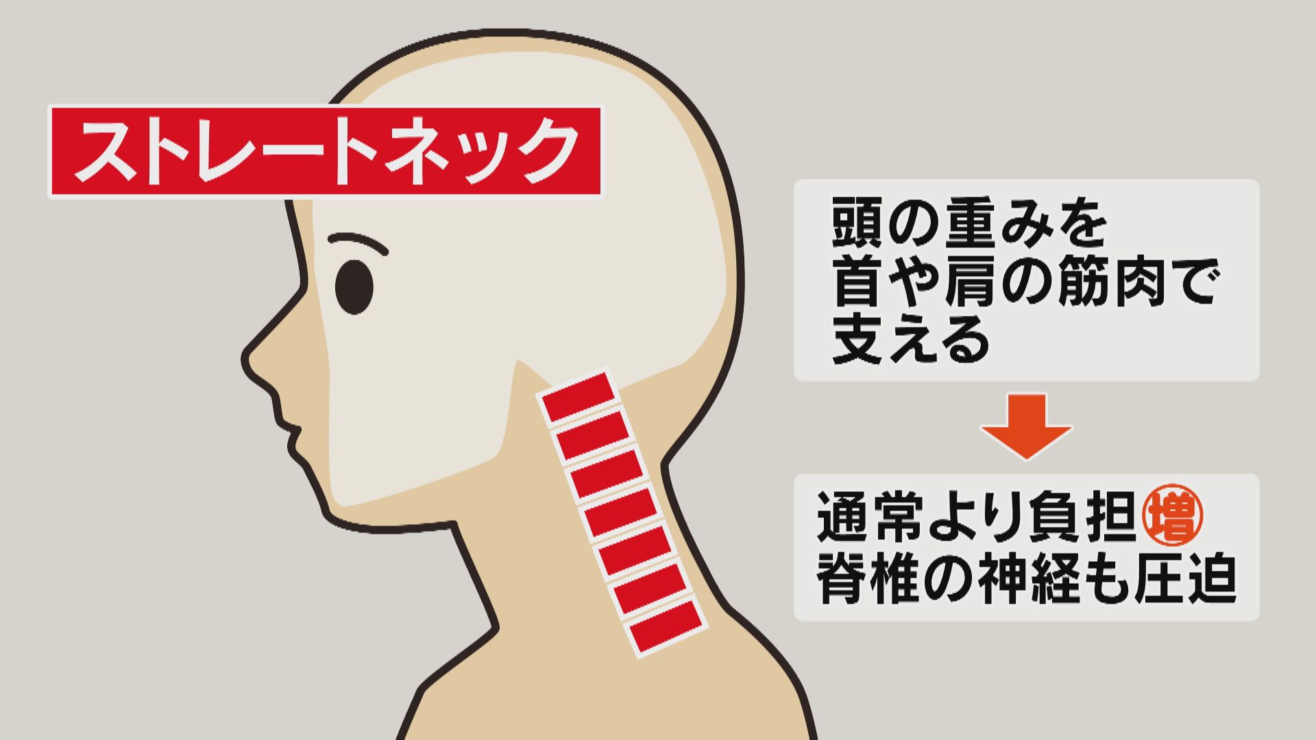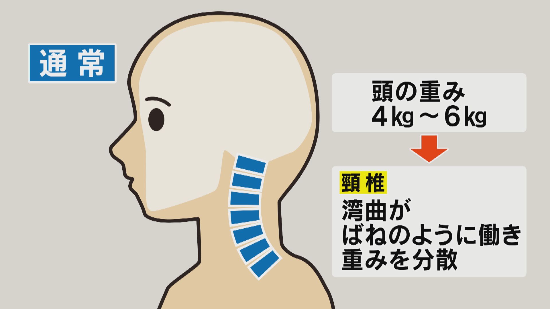 「(頭の)重みが一気にドンと乗っかって、直接、首の骨、体全体に重みがかかるもので、首の痛みとか、頭痛、目の疲れ、慢性的な肩こりといったことが生じる」
