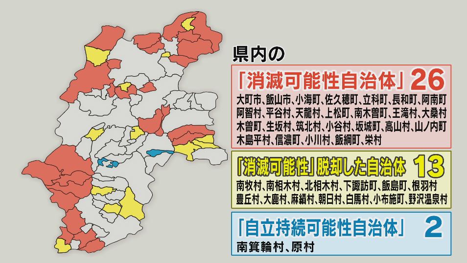 今回の報告書で「消滅可能性自治体」とされた長野県内の自治体は以下の通り。