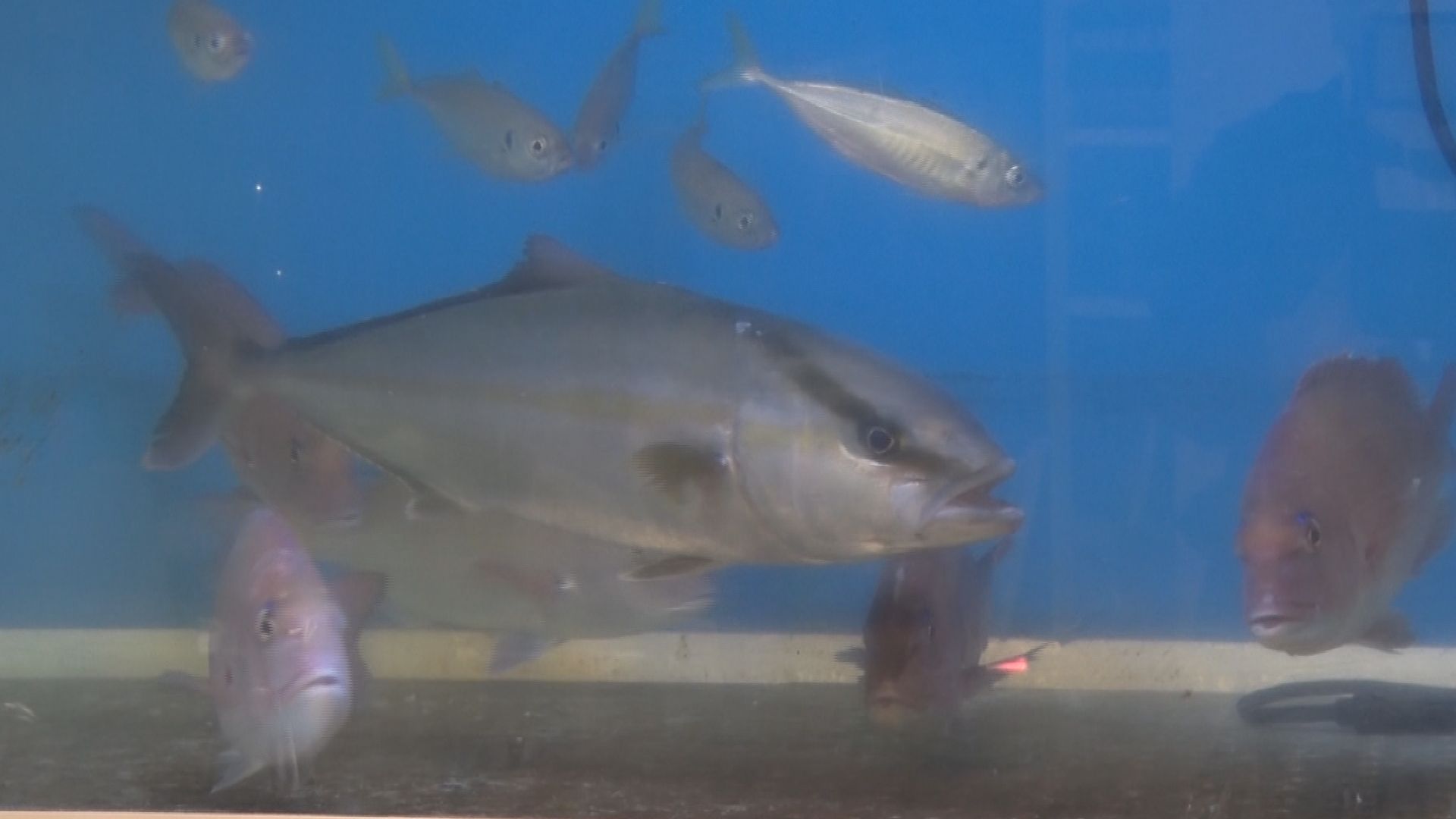 4月初めに飲食の営業許可を取得し店内にはマダイやカンパチなど約30匹の魚が泳ぐ大型水槽も設置。