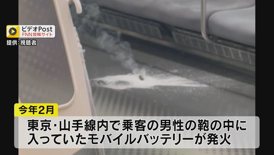 2024年2月、東京・山手線内で乗客の男性の鞄の中に入っていたモバイルバッテリーが発火。