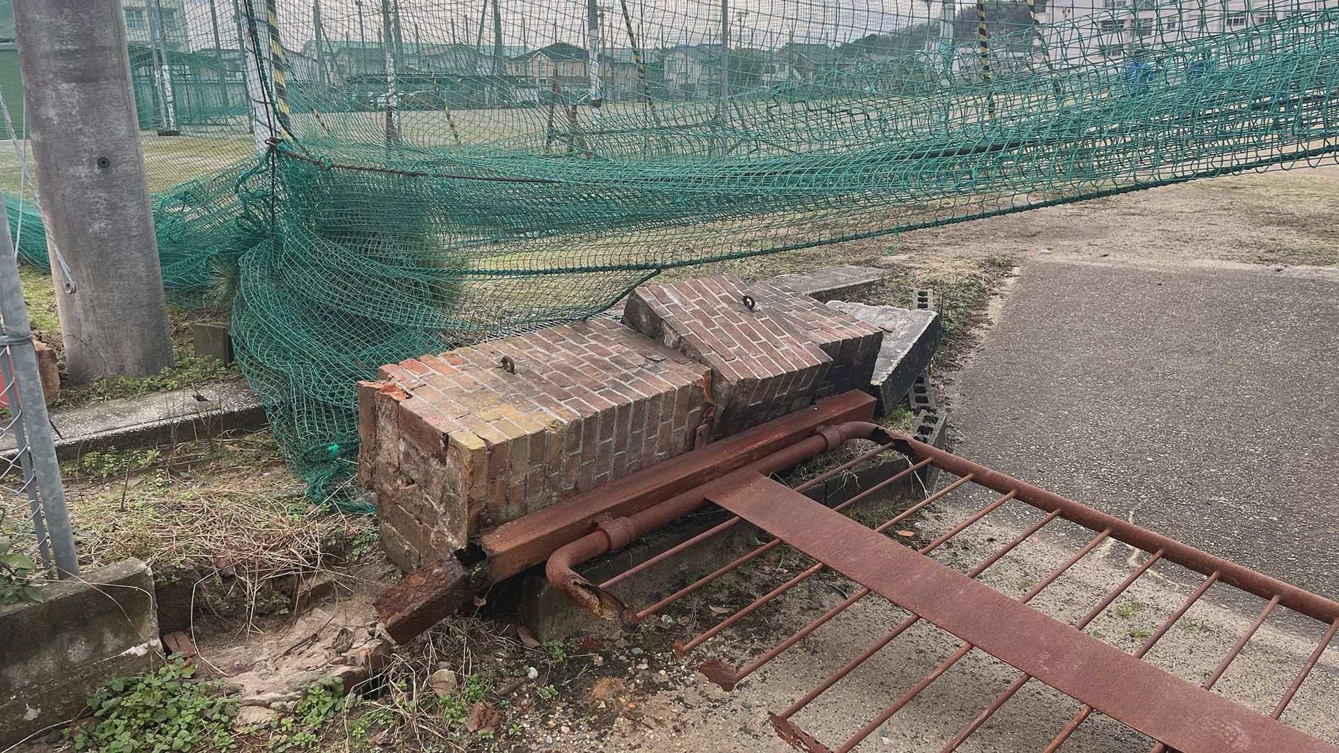 グラウンドでは、他に出入り口の門が倒れ、照明の支柱は傾く被害もありました。