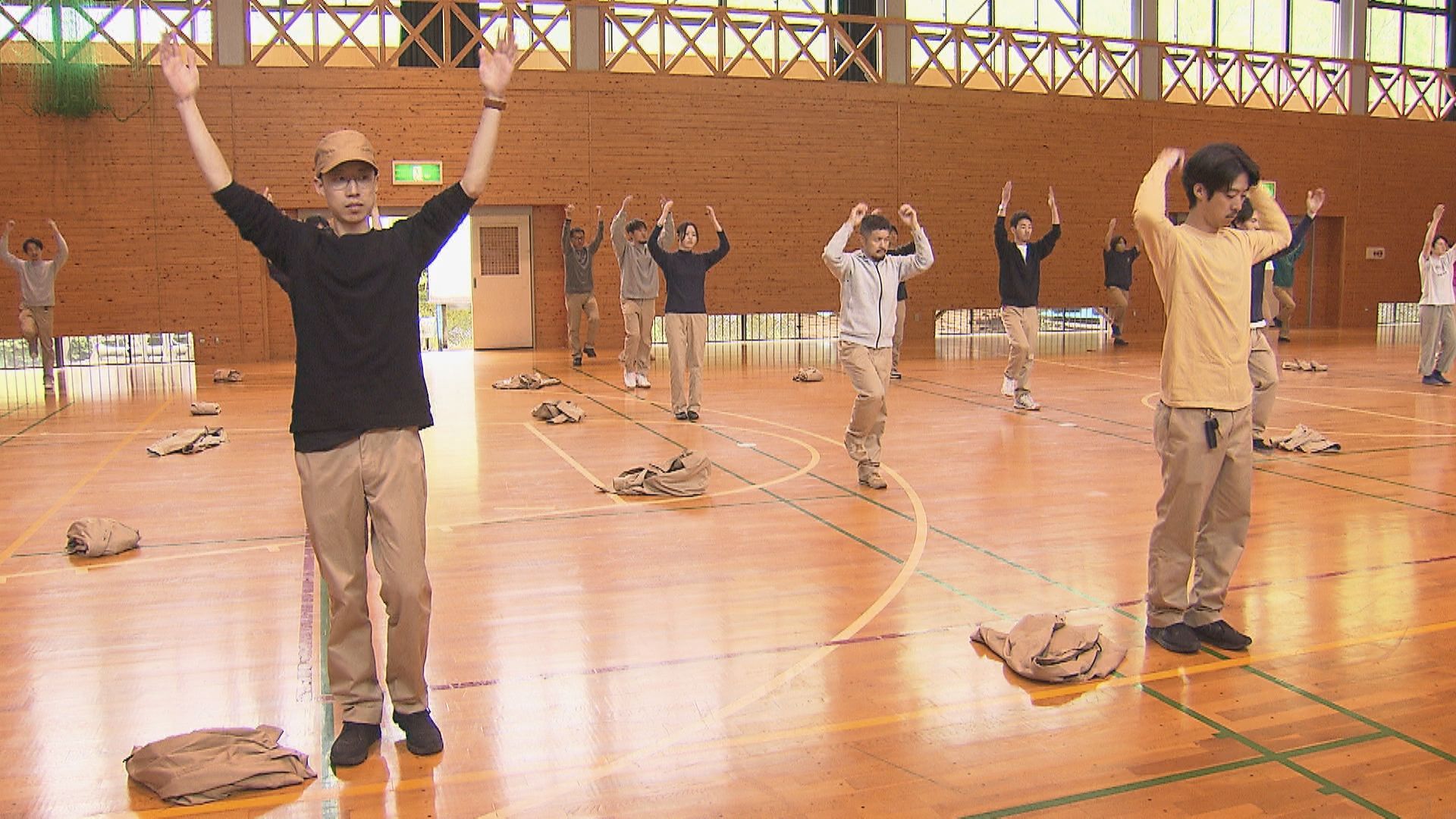 朝8時半、体育館で朝礼を兼ねた準備運動で1日が始まります。