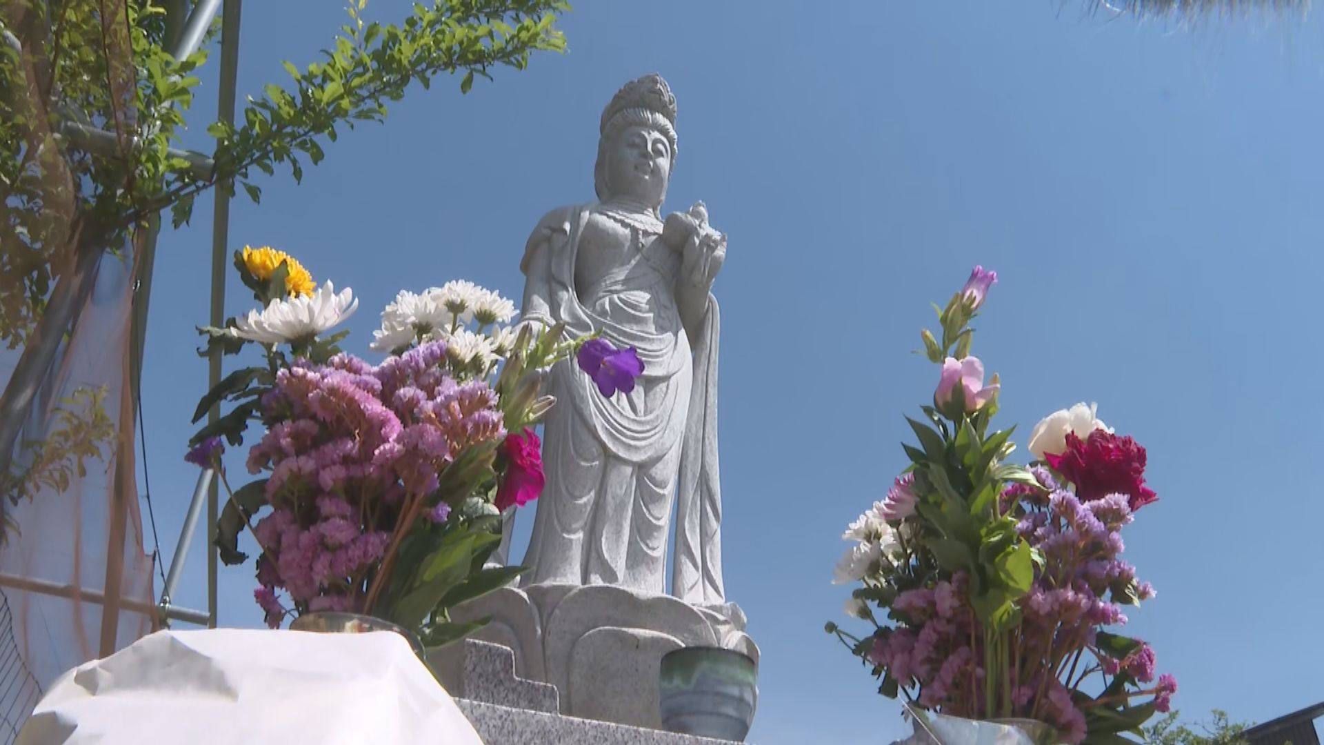 被告の両親が自宅脇に建てた観音像にも「ご冥福をお祈りします」と書かれた新しい花束が手向けられていました。