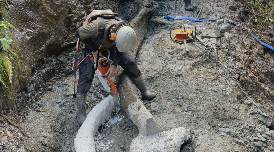 大きな化石を切り出すには専用の機材が必要で、作業を手伝う学生たちの力も不可欠です。